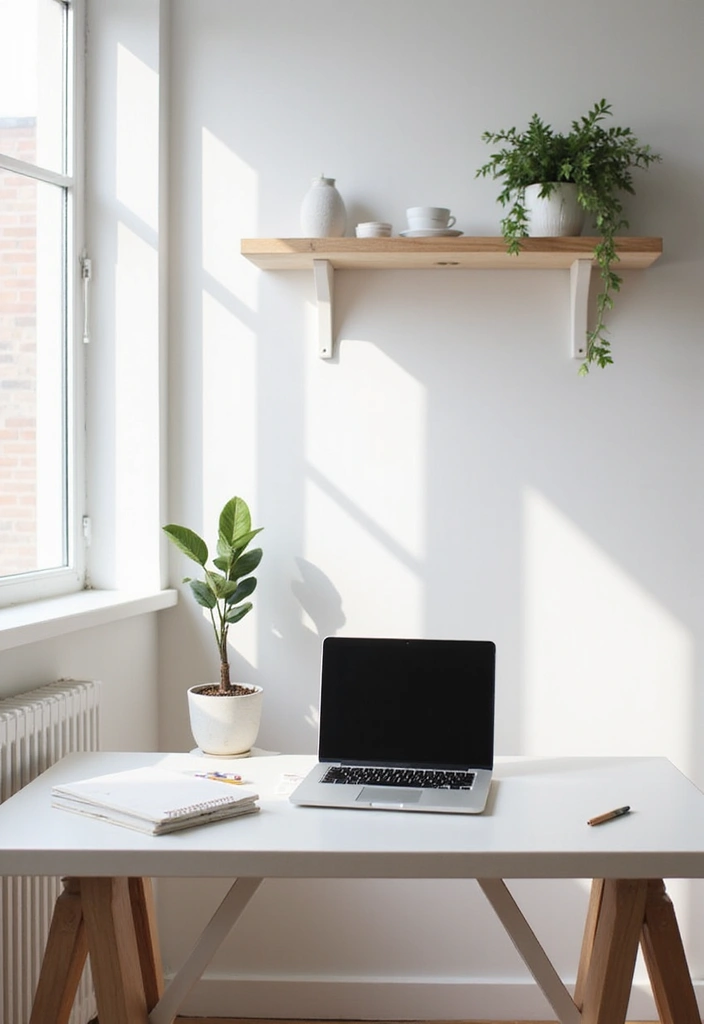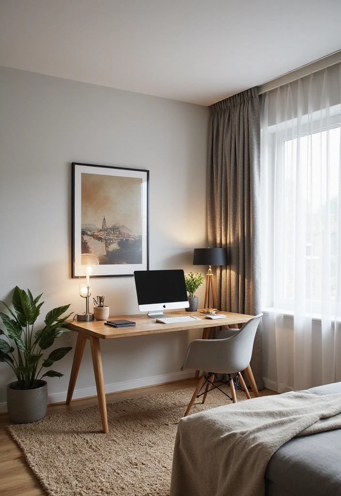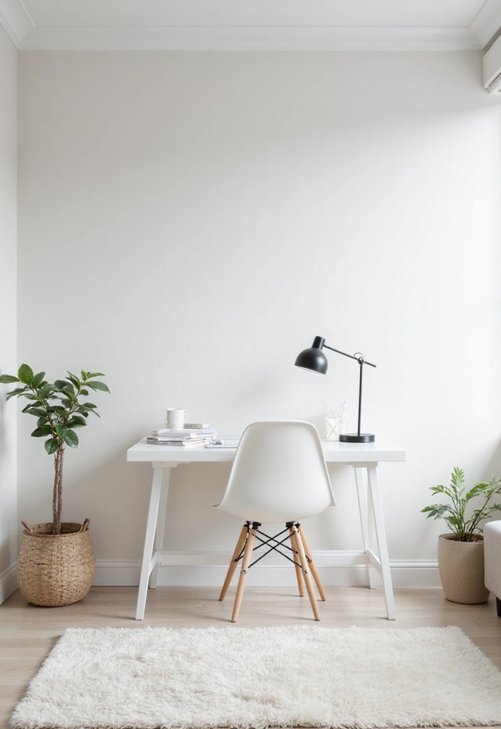 This design emphasizes a neutral color palette, bright whites, and soft textures. Picture a white desk that provides a sleek and modern foundation, light walls, and soft furnishings that create a serene atmosphere. This style feels fresh and is great for keeping the mood upbeat and focused.