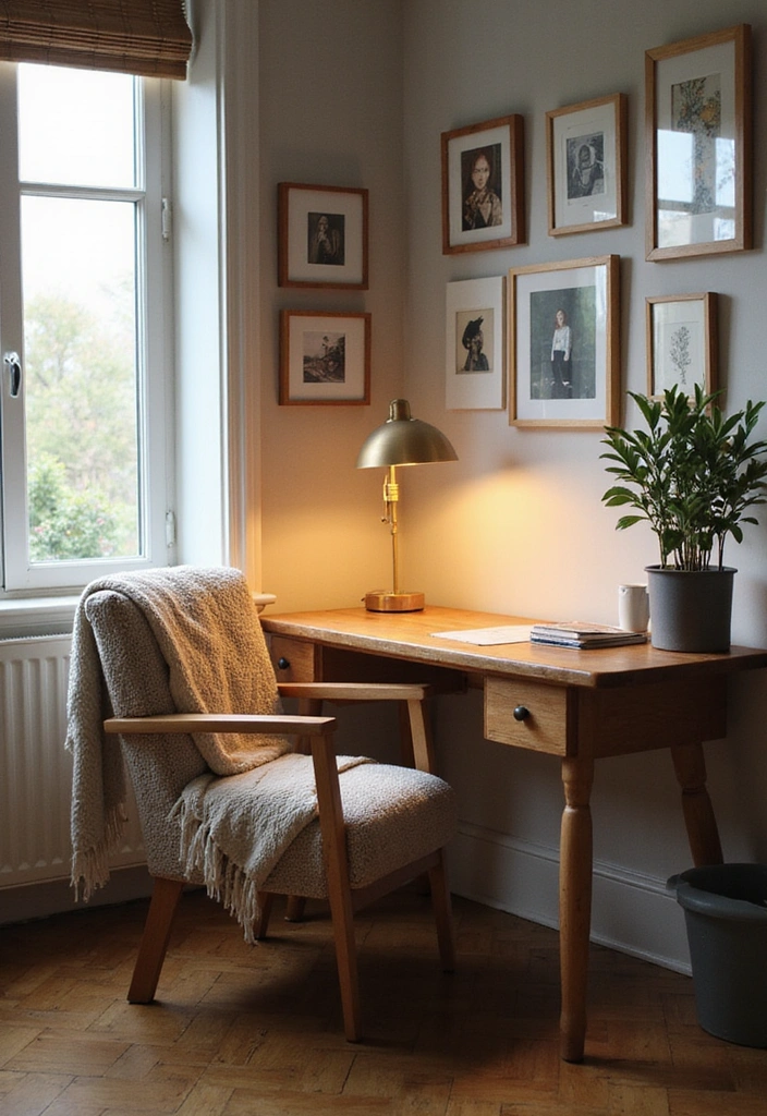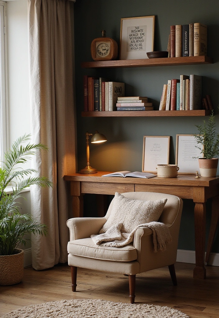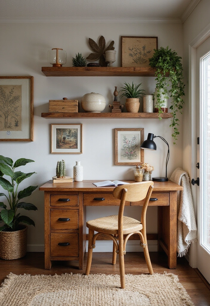 This workspace feels inviting and encourages a sense of calm, perfect for productive days. To complete the look, consider integrating vintage decor items that reflect your personality and style, and adorn your walls with rustic wall art to inspire creativity and add warmth to your home office environment.