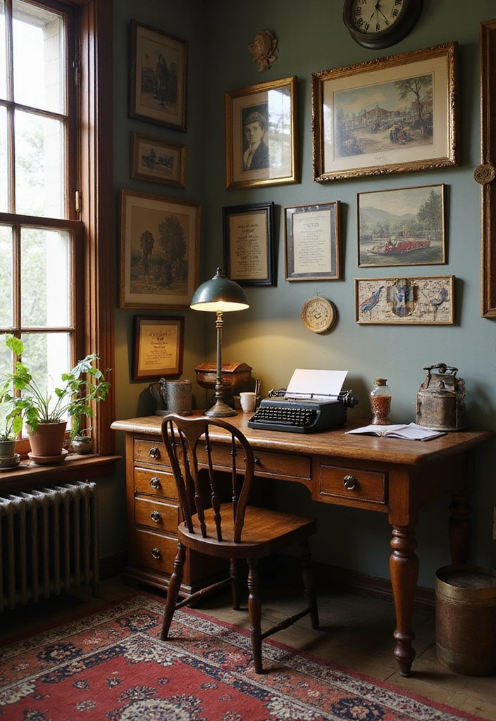 This style incorporates antique furniture, retro decor, and nostalgic color palettes. Imagine a vintage desk, like this antique desk, paired with an old-school typewriter such as this retro typewriter and vintage artwork on the walls. The desk not only serves as a beautiful centerpiece but also offers ample workspace and a unique character that complements the vintage theme. This design tells a story and creates a unique environment.