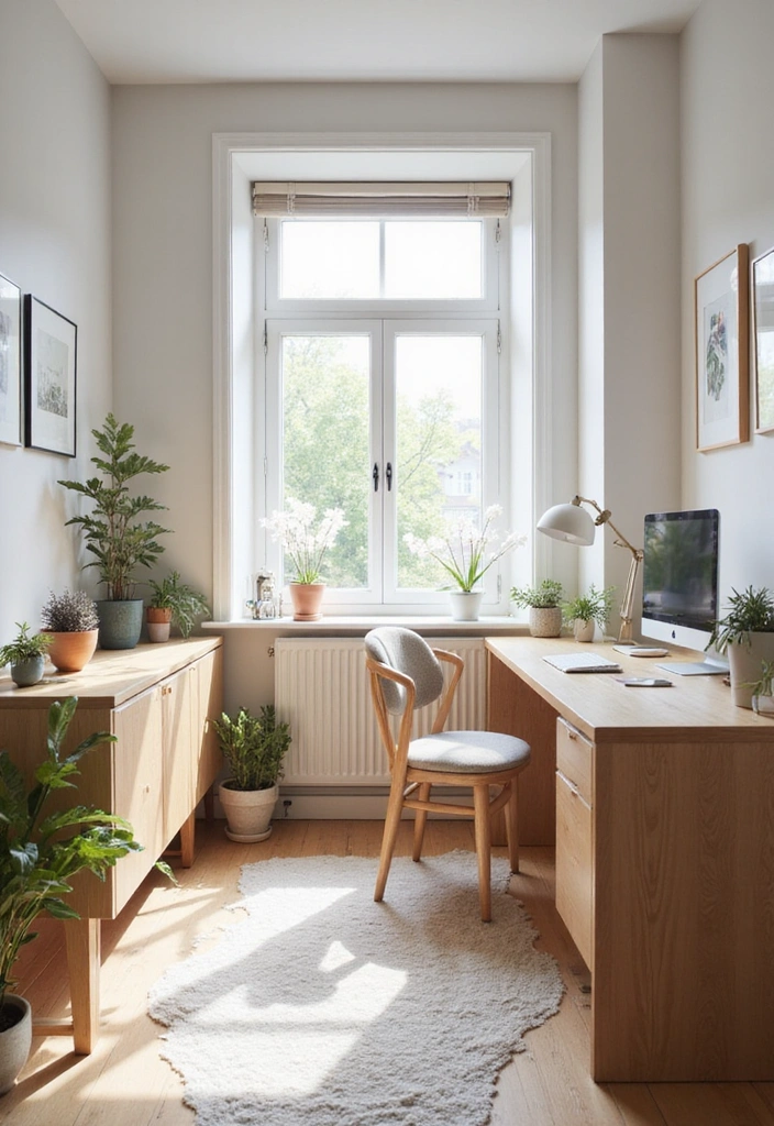 With its focus on minimalism, this style features light wood materials, clean lines, and soft textiles. Consider a light wood desk, which not only complements the overall aesthetic but also provides a sturdy workspace for your daily tasks. The natural finish of the desk adds warmth and a sense of tranquility to your office, making it easier to focus.