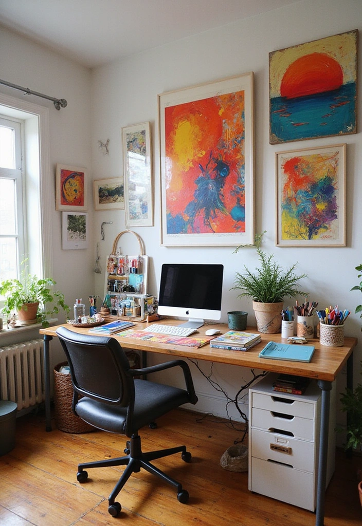 This design embraces bold colors, abstract art, and unique decor that inspires creativity. Picture a desk surrounded by your favorite art pieces, vibrant colors, and a well-organized art supply station. Your workspace should feel like a blank canvas ready for your next masterpiece.