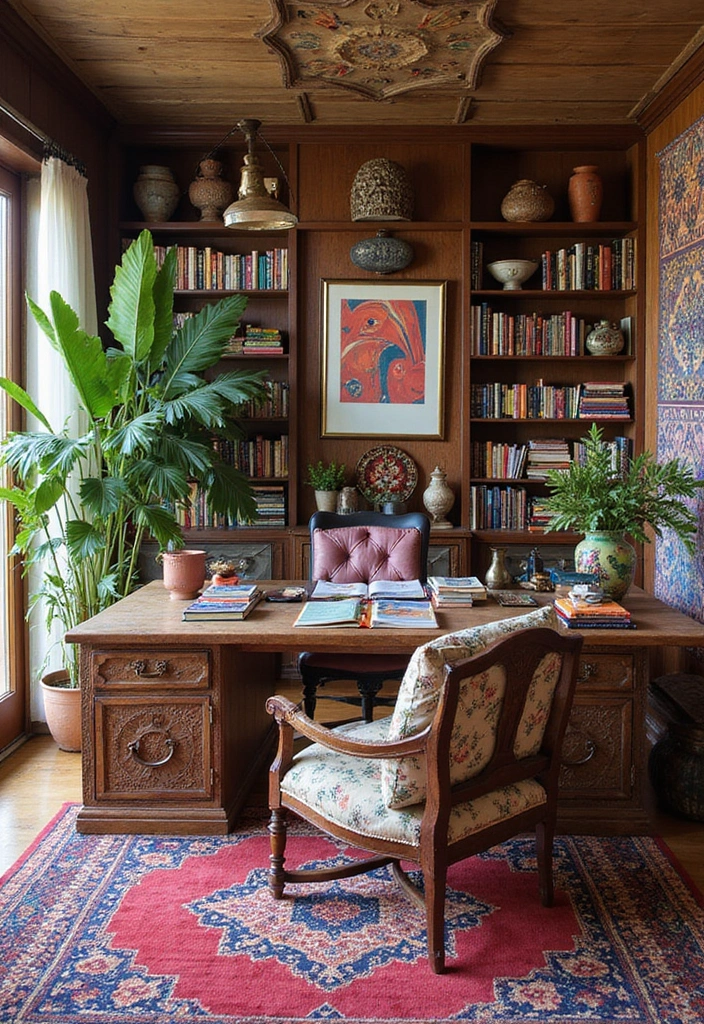 This style incorporates elements from different cultures, colorful textiles, unique artifacts, and eclectic patterns. Imagine a workspace filled with Moroccan rugs, Indian textiles, and Asian-inspired decor. It’s a celebration of global beauty and creativity. To achieve this, consider adding global textiles that not only bring warmth but also offer a cozy feel, perfect for those long work hours.