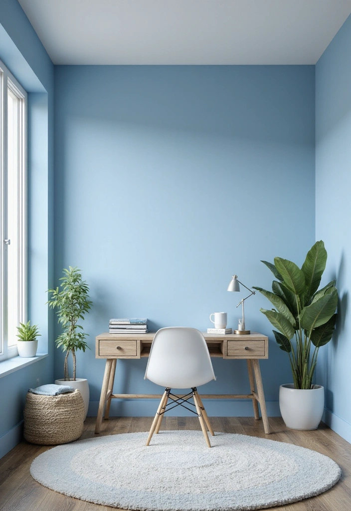 – Paint your walls a soft blue for a serene backdrop. A great option is this blue wall paint, which provides a soothing yet vibrant shade that can transform your workspace into a calming retreat.