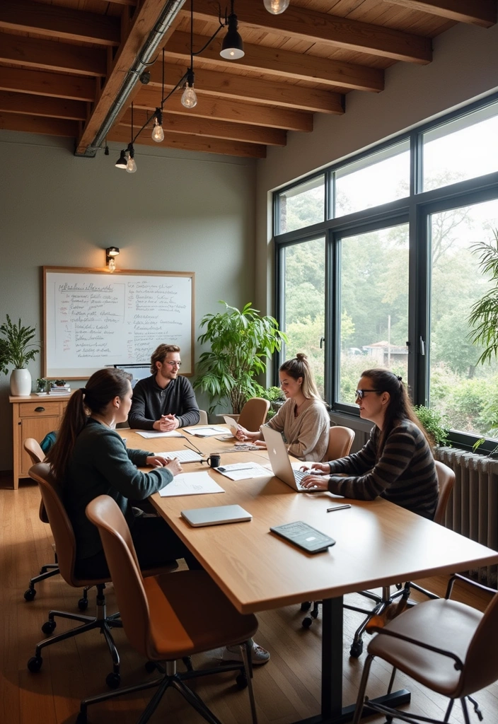Consider shared tables, comfortable seating arrangements, and whiteboards for brainstorming sessions. Your space should facilitate discussion and creativity, combining comfort with functionality. Imagine a large table, like this large collaborative table that provides ample space for team meetings, paired with comfortable seating to keep everyone relaxed during longer discussions. Both elements are essential for fostering an inviting atmosphere where ideas can flow freely.