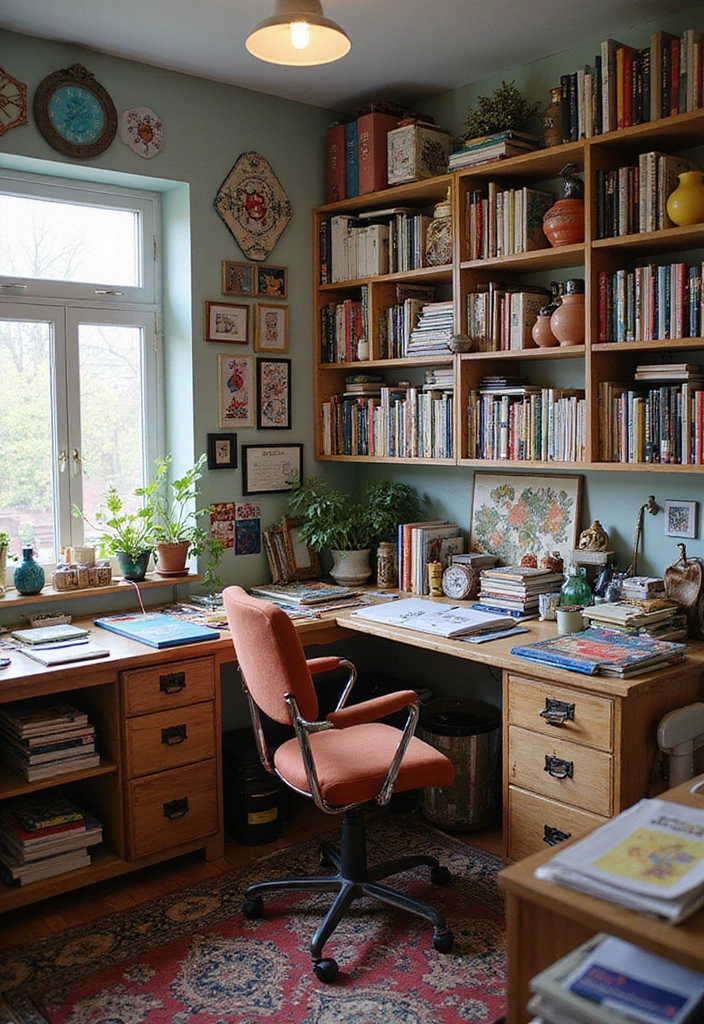 This workspace feels lively and unique, sparking ideas and creativity effortlessly. Enhance your space further with stylish desk accessories that not only add flair but also help you stay organized, making your creative process even more enjoyable.