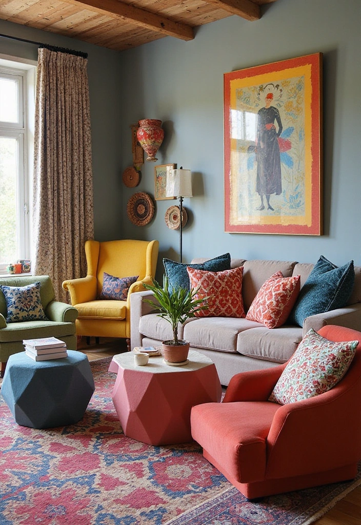 Mix and match colors and patterns for a playful, eclectic vibe; think floral prints on chairs with eclectic throw pillows featuring geometric designs. Don’t shy away from statement pieces, like a bright orange accent chair or a striking patterned accent rug that draws the eye. These elements not only enhance the visual appeal of your space but also reflect your personal style.