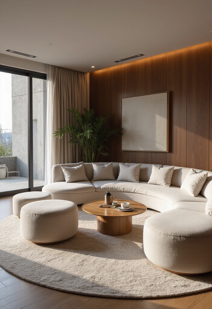 Consider adding a curved sectional sofa for a unique seating experience that encourages conversation. Its minimalist design and plush fabric make it an excellent centerpiece for your living room. Round ottomans, like the round ottoman, can add comfort and visual interest while providing additional seating or a place to rest your feet.