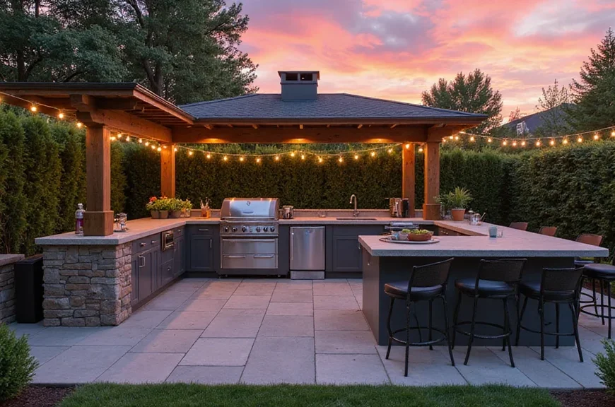 For those who love hosting, an entertainer’s paradise outdoor kitchen is essential. Design a spacious area with multiple cooking stations, including a grill, smoker, and outdoor bar. Comfortable seating areas and a fire pit will invite guests to relax. Add a sound system for music and a mini fridge for easy drink access. Choose weather-resistant furniture that blends style with durability. Decorative elements like lanterns and colorful cushions can tie the space together. This outdoor kitchen will be the ultimate gathering spot. Design multiple cooking stations for versatility