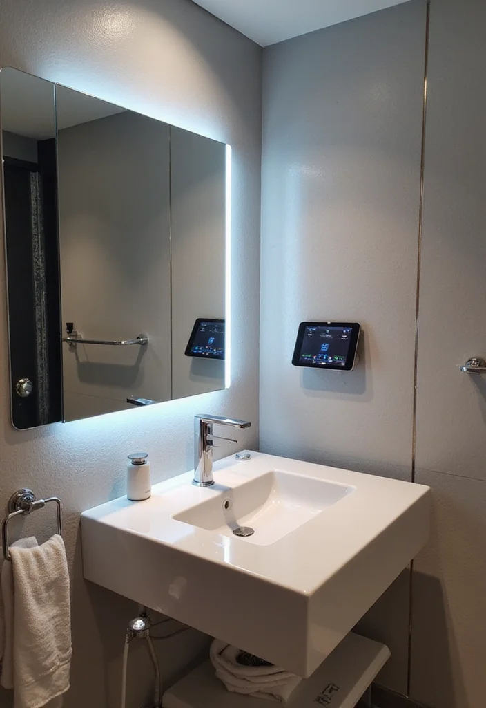 This design choice enhances both functionality and style. Embracing high-tech elements creates a contemporary bathroom that is both practical and visually appealing.
