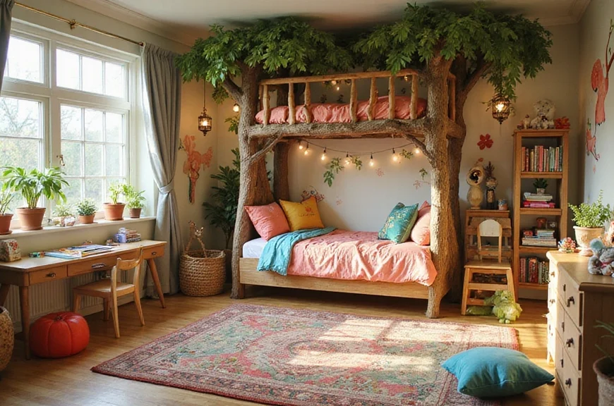 A whimsical treehouse bed can be the centerpiece, encouraging your child to climb into their own little world.